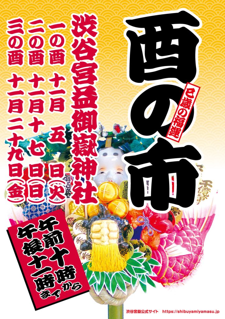 今年の酉の市は三の酉まで。一の酉 11月5日㈫二の酉 11月17日㈰三の酉 11月29日㈮ 渋谷宮益御嶽神社 午前10時から午後11時まで 一の酉(2024年11月5日㈫) 一の酉の宮益坂(2024年11月5日㈫) 二の酉(2024年11月17日㈰) 暖かい二の酉。半袖Tシャツの人も。(2024年11月17日㈰) 三の酉(2024年11月29日㈮) 三の酉(2024年11月29日㈮) 共有: Facebook で共有するにはクリックしてください (新しいウィンドウで開きます) Facebook クリックして X で共有 (新しいウィンドウで開きます) X いいね:いいね 読み込み中… 関連 FacebookXBluesky